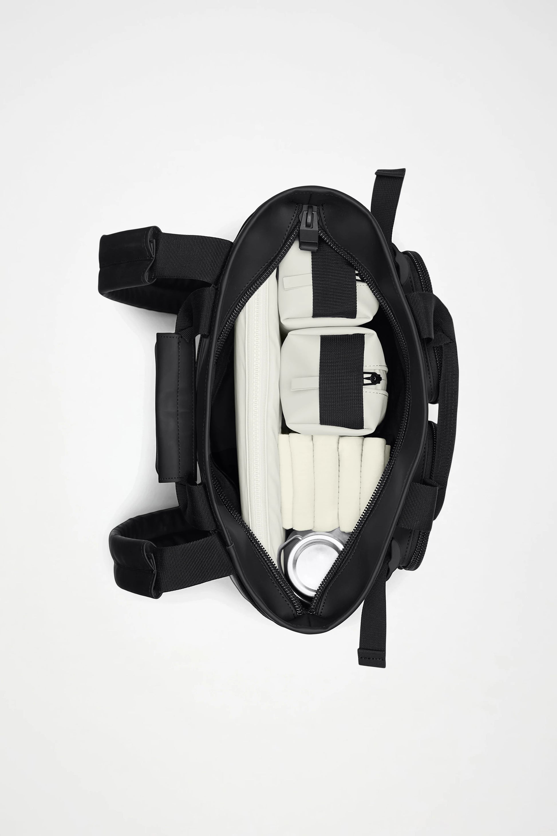 Λειτουργεί τόσο ως αδιάβροχη tote όσο και ως backpack, και φοριέται με ρυθμιζόμενους, ενισχυμένους ιμάντες ώμου. Ανοίγοντας την τσάντα αποκαλύπτεται ευρύχωρος κύριος χώρος με διχτυωτές και εσωτερικές τσέπες με φερμουάρ, καθώς και ενισχυμένη θήκη για laptop έως 15".
